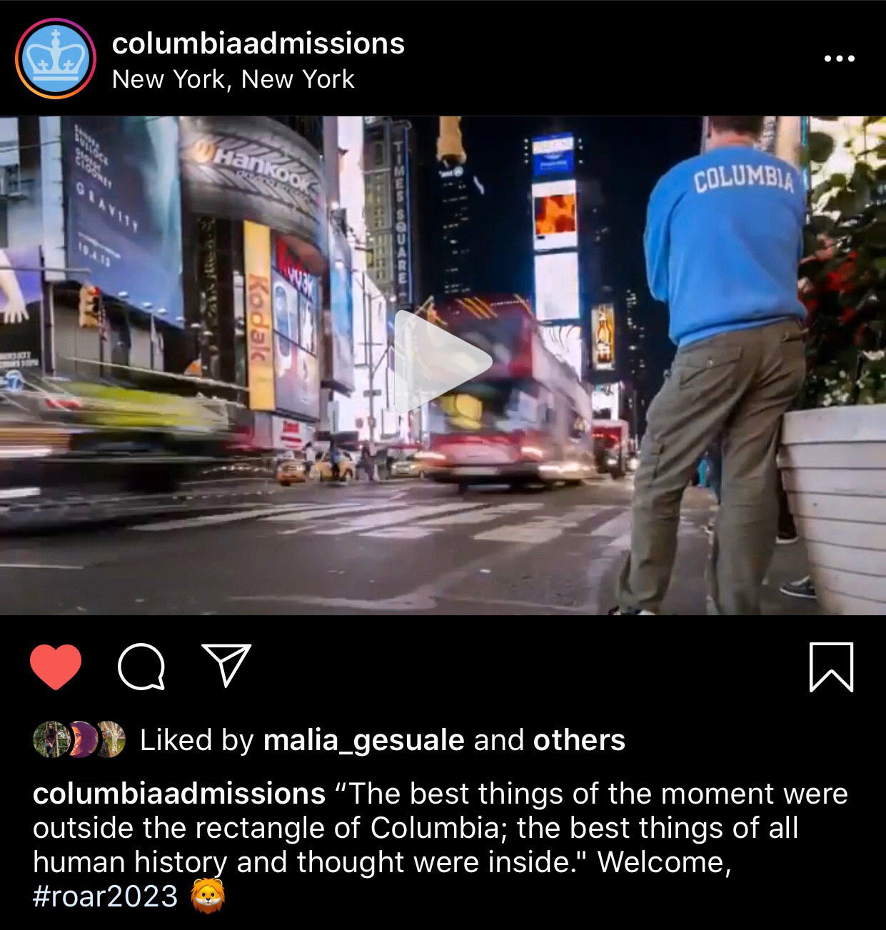 as a member of Columbia's social media team, I developed content strategy and social copy targeted at applicants during the crucial three-month decision period between applying and committing.